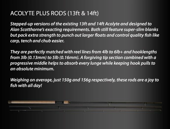 - A stepped up version of the ultra, the 13ft Acolyte Plus has more power in reserve to subdue quality fish, for casting larger floats and longer distances.Â