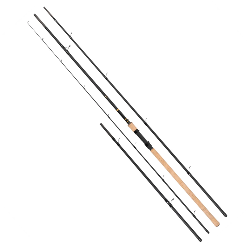 A high modulus parabolic carbon blank with a fast tip action to help hit those quick biting fish. At home on both running and still water. Suitable for use with centrepin and fixed spool reels. The larger diameter guides allow much stronger reel lines than you’d normally get away with. Making trotting for larger freshwater species possible. Finished with a full cork handle and eye catching cosmetics there are 2 models available in the range a 13ft and a 12ft model with an extension to take it to 14ft.